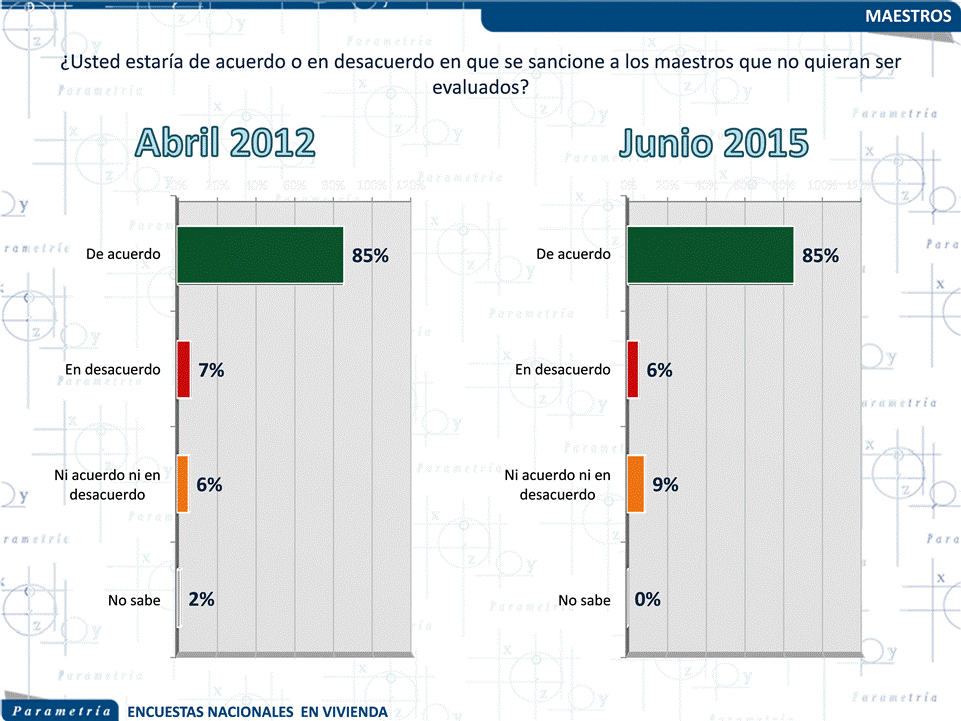 En el país además de apoyar la evaluación de los profesores, más mexicanos están de acuerdo con que exista una sanción a los maestros que no quieran ser evaluados. El 85 % de los entrevistados dijo estar de acuerdo con que sean penalizados. Dichas opiniones han perdurado desde 2012 cuando realizamos la pregunta por primera vez.