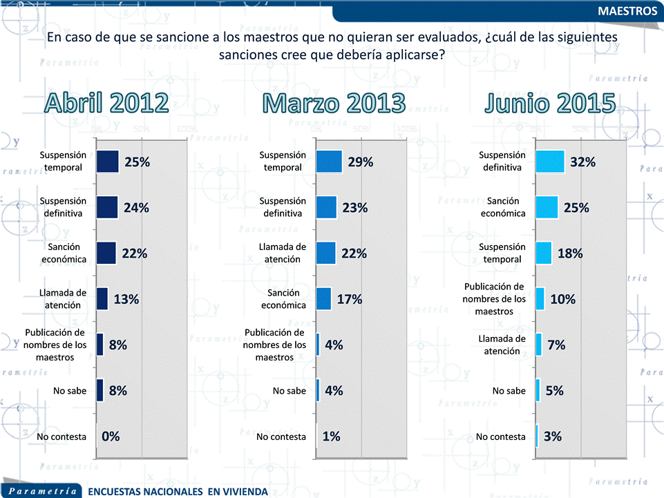 En la opinión de los mexicanos sobre el tipo de sanciones que deben tener los maestros que se nieguen a ser evaluados observamos un cambio importante respecto de las mediciones realizadas en otros años. En 2012 y 2013 las primeras opciones de respuesta respecto al tipo de castigo que debía aplicarse a estos maestros era que fueran suspendidos temporalmente. Así lo sugirió el 25 % el año antepasado y el 29 % el año pasado. Sin embargo, en la más reciente medición de 2015, la primera opción es ocupada por la suspensión definitiva, con el 32 % de las menciones. La suspensión temporal pasó al tercer sitio.