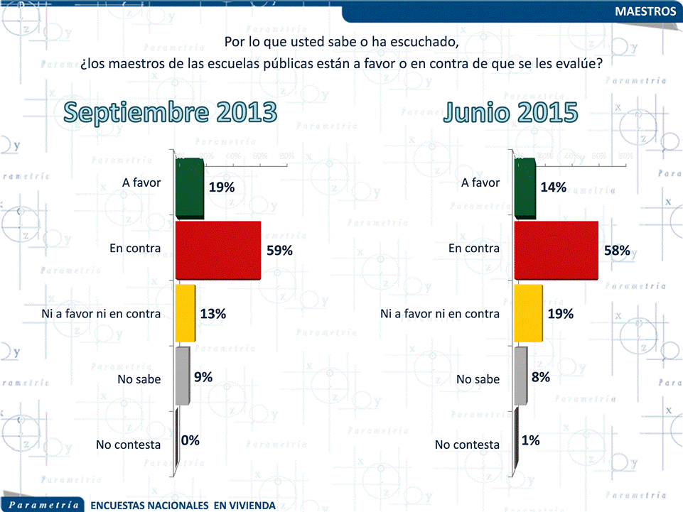 Los datos de la encuesta señalan que los entrevistados perciben que los maestros se oponen a ser evaluados. Seis de cada diez entrevistados (58 %) dijo que por lo que sabe o ha escuchado los maestros de las escuelas públicas están en contra de que se les evalúe. Solo 14 % considera que los docentes están a favor de ser sometidos a pruebas que determinen si cumplen o no con el perfil del puesto. Las opiniones en el tema no presentan cambios importantes respecto a 2013, cuando 59 % también dijo que rechazaban la evaluación.