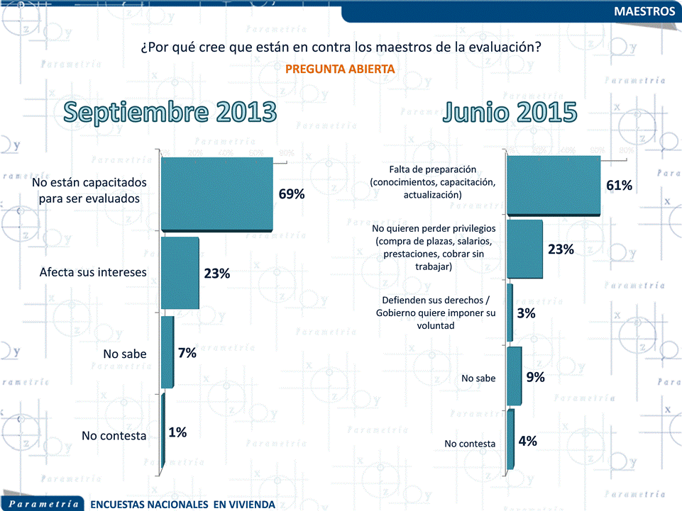 En una pregunta abierta, es decir, sin dar opciones de respuesta a los entrevistados, indagamos cuáles creían los ciudadanos que eran las causas por las cuales los maestros estaban en contra de ser evaluados. Al respecto en el último levantamiento, el 61 % dijo que los profesores de las escuelas no querían ser evaluados por que les falta preparación, 23 % consideró que era por no querían perder privilegios, y únicamente 3 % señaló que por defender sus derechos. Es posible observar que la argumentación de los maestros que están en contra de la evaluación por una cuestión de defensa de derechos, no ha permeado en la opinión pública.