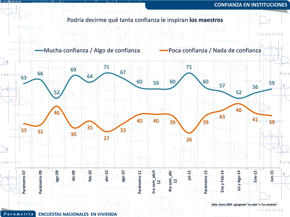 PARAMETRÍA: Encuesta Nacional en vivienda. Representatividad: Nacional. Número de entrevistas: 800 cuestionarios hechos a personas de 18 años en adelante con credencial para votar que residan en el lugar de interés al momento de la entrevista. Fecha de levantamiento: del 20 al 24 de junio de 2015. Tasa de Rechazo: 46 %. Nivel de confianza estadística: 95 %. Margen de error: (+/-) 3.5 %. Diseño, muestreo, operativo de campo y análisis: Parametría SA de CV. Método de muestreo: Aleatorio sistemático con probabilidad proporcional al tamaño. Unidad de muestreo: Las secciones electorales reportadas por el INE.