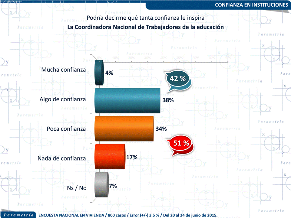 A diferencia de la confianza que inspiran los maestros, la Coordinadora Nacional de Trabajadores de la Educación tiene mayores porcentajes de personas que dicen confiar poco o nada en esta institución que aquellos que opinan lo contrario (51 % vs 42 %)