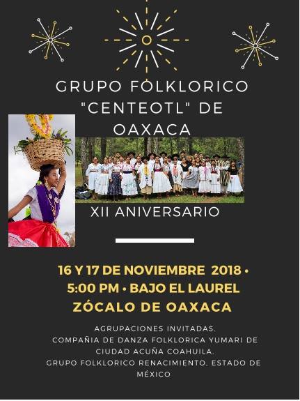 Oaxaca.- El grupo folclórico “Centéotl” cumple su décimo segundo aniversario y para celebrarlo invita al público en general a participar de su festejo con dos magnas presentaciones en el espacio cultural “Bajo El Laurel”.
