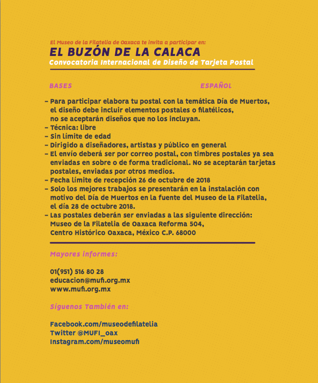 Oaxaca.- En su 6ª Edición del ‘Buzón de la Calaca’, el Museo de la Filatelia de Oaxaca invita a participar en esta convocatoria internacional para diseño de una tarjeta postal que ensalse el tradicional día de Muertos.