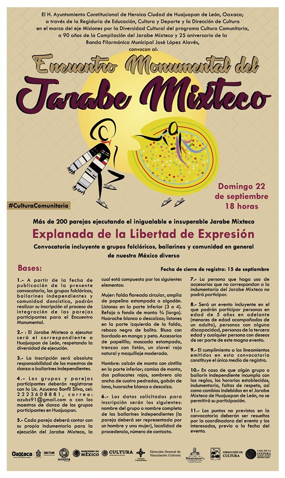 El Encuentro Monumental del Jarabe Mixteco se llevará a cabo en el marco del festival Jolgorio, como parte del proyecto Misiones por la Diversidad de la Secretaría de Cultura federal y que se organiza en coordinación con las autoridades municipales de Huajuapan de León.