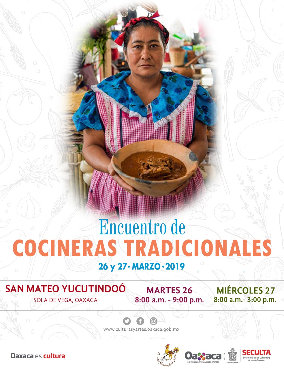 Oaxaca.-La Secretaría de las Culturas y Artes de Oaxaca (Seculta) invita al encuentro de Cocineras Tradicionales que se llevará a cabo el martes 26 y miércoles 27 de marzo, en San Mateo Yucutindoó, perteneciente a la Sierra Sur.