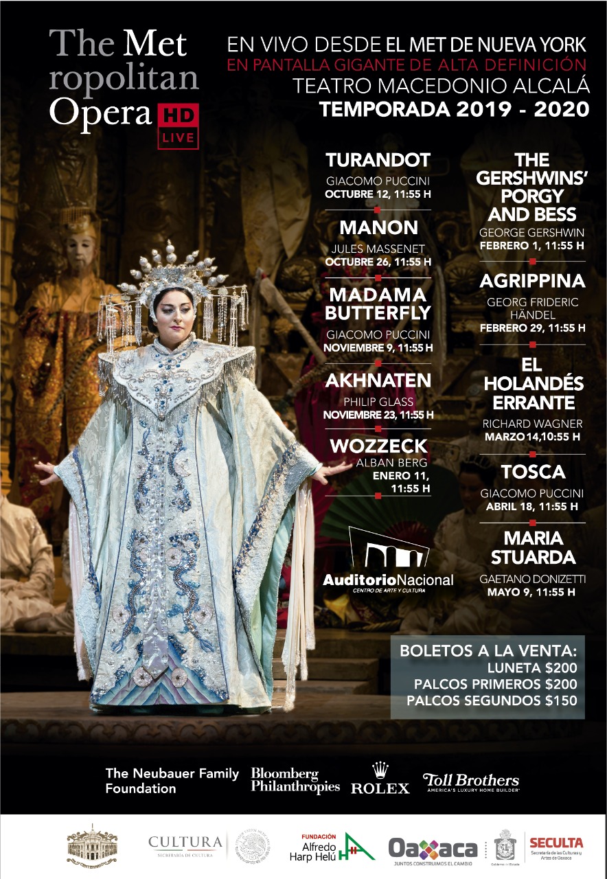 Oaxaca.-La Secretaría de las Culturas y Artes de Oaxaca (Seculta), informó que este sábado 12 de octubre inicia la temporada 2019-2020 de La Ópera Metropolitana de Nueva York (The Metropolitan Opera, “The MET” por sus siglas en inglés)
