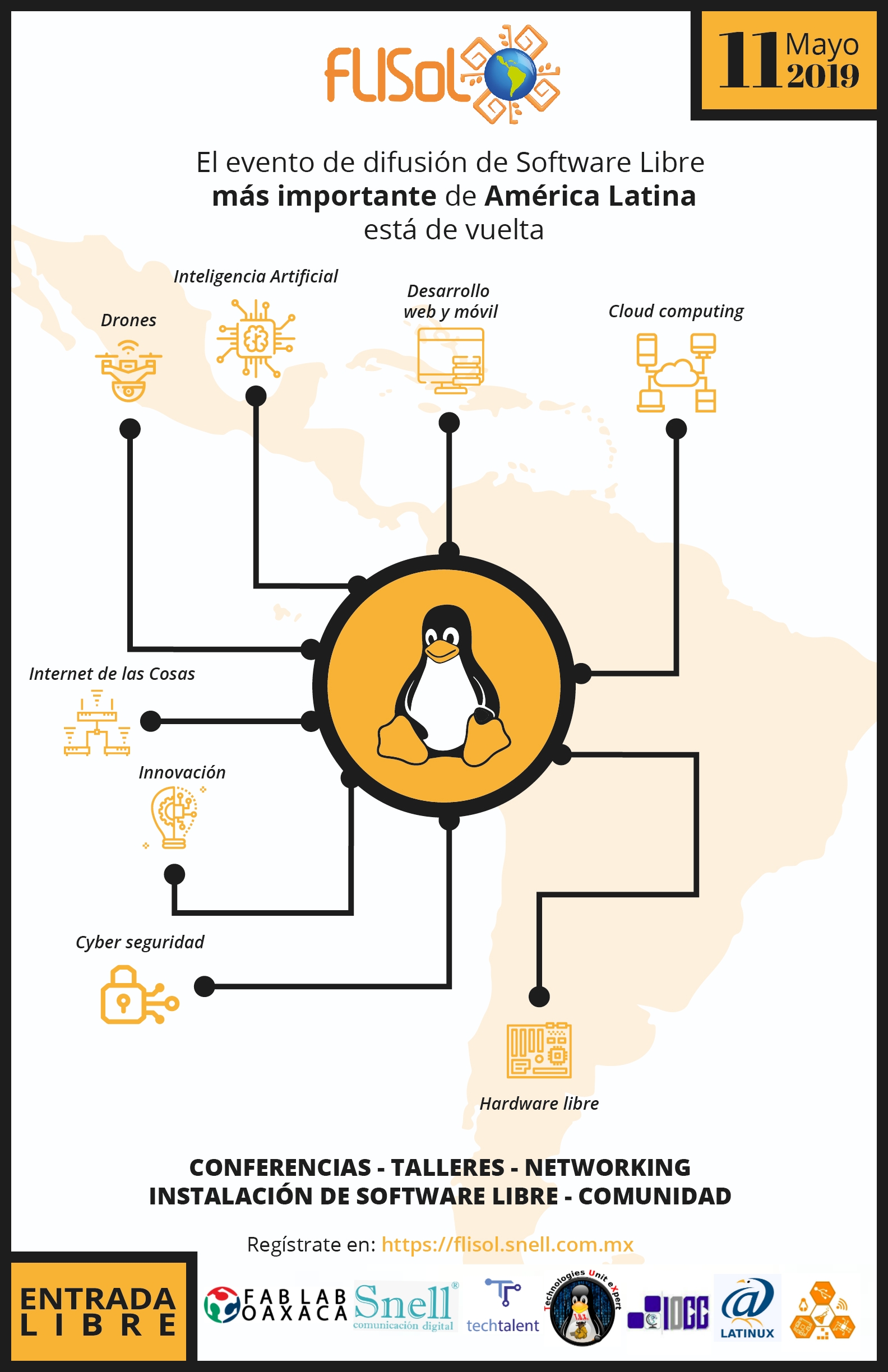 El FLISoL 2019, se celebrará en todos los países de Latinoamérica, la sede en el Estado de Oaxaca será en el edificio ubicado en calle Huertos Plataneras esquina Huertos Laureles, Trinidad de las Huertas, atrás de pitico de CU. CEPOS-SECCXXII, el dia 11 de Mayo a partir de las 9:00 a.m.