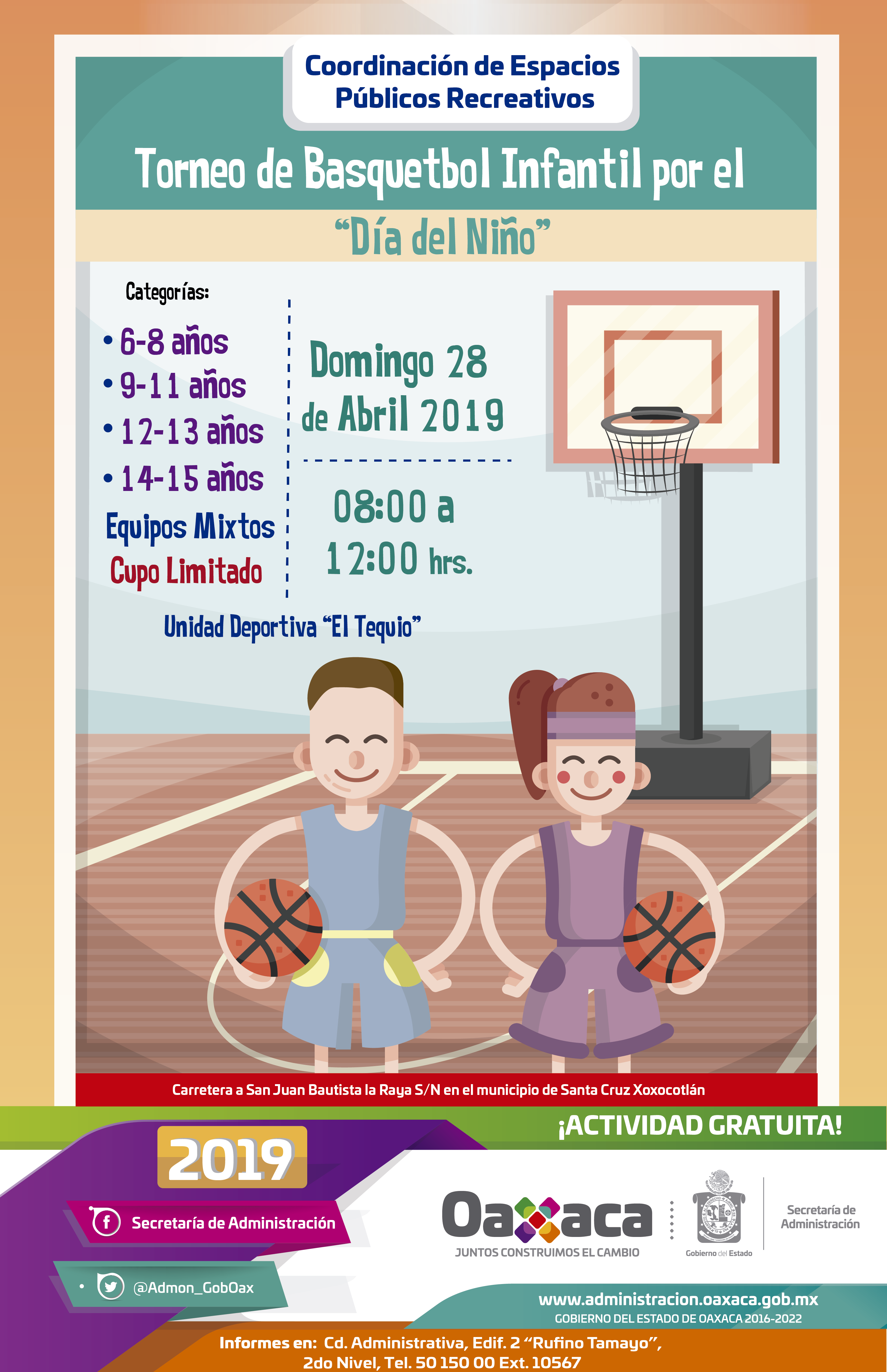 Oaxaca.-Para celebrar el Día del Niño el próximo 30 de abril, la Secretaría de Administración, a través de la Coordinación de Espacios Públicos Recreativos llevará a cabo un Torneo de Básquetbol Infantil, propiciando el deporte y la sana convivencia entre las familias de la capital y municipios conurbados.