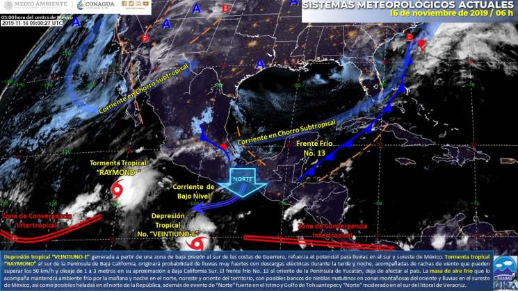 Oaxaca.-Para hoy, se espera que el frente frío No. 13 se ubique sobre el Mar Caribe, dejando de afectar al país; sin embargo, la masa de aire frío que lo impulsó mantendrá ambiente frío en el norte, noreste y oriente del territorio, con posibles bancos de nieblas matutinos en zonas montañosas del oriente y lluvias en el sureste de México, así como posibles heladas en el norte de la República, además de evento de “Norte” fuerte en el Istmo y Golfo de Tehuantepec, así como moderado en el sur del litoral de Veracruz. La tormenta tropical “Raymond” se ubicará al sur de la Península de Baja California, originando probabilidad de lluvias puntuales muy fuertes con descargas eléctricas, principalmente en horas de la tarde y noche, mismas que se acompañarán de rachas de viento que pueden superar los 50 km/h y oleaje de 1 a 3 metros en Baja California Sur. La depresión tropical No. 21-E se ha generado a partir de una zona de baja presión al sur de Guerrero y la onda tropical No. 53 ha sido absorbida por la circulación de la depresión tropical.