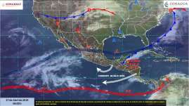Para hoy, el frente frío No. 53 interaccionará con una línea seca y con la corriente en chorro, ocasionando potencial de chubas...