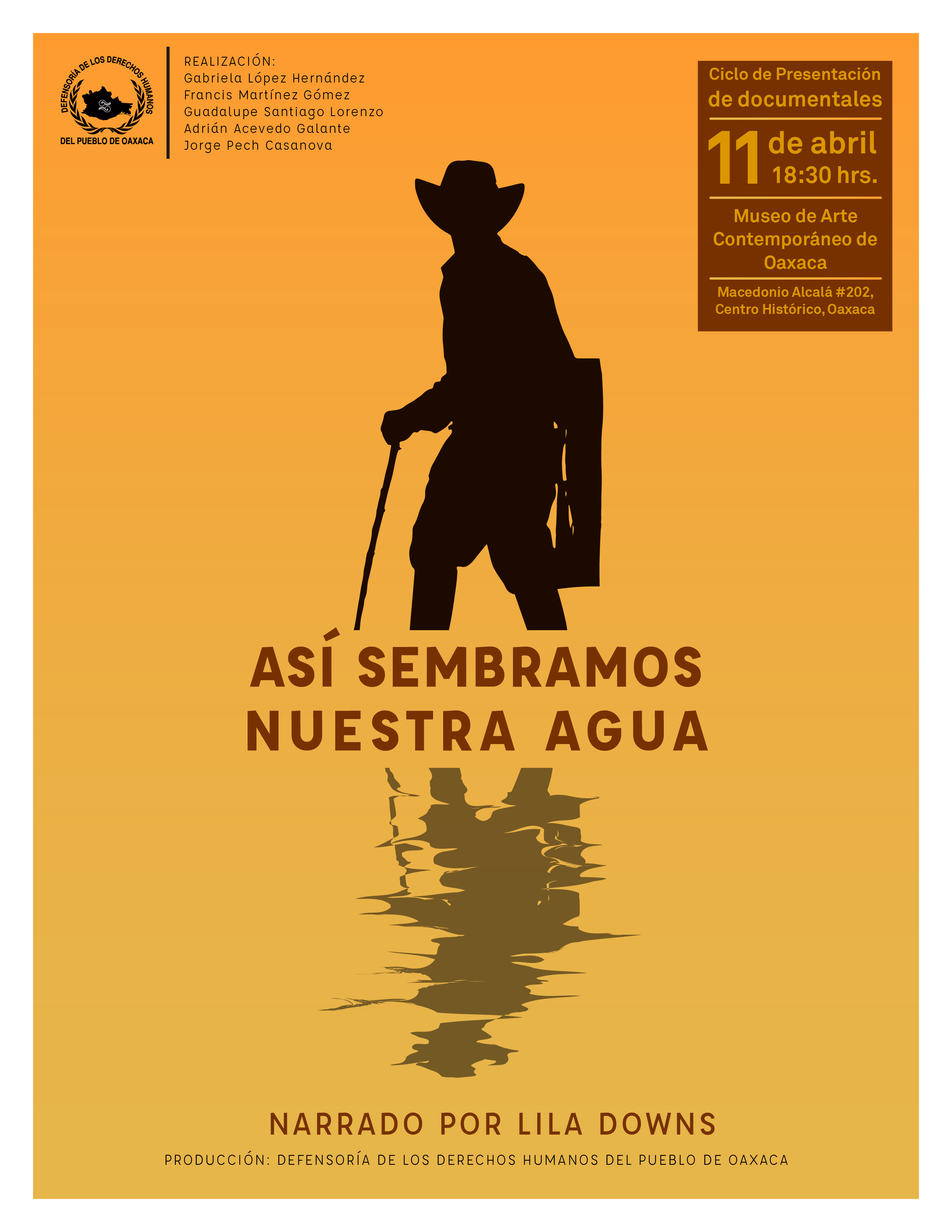 Oaxaca.-La Defensoría de los Derechos Humanos del Pueblo de Oaxaca proyectará el documental “Así sembramos nuestra agua”, realizado por la Dirección de Comunicación Social del organismo defensor y narrado por la compositora y cantante Lila Downs, el jueves 11 de abril próximo, a las 18:00 horas, en el Museo de Arte Contemporáneo de Oaxaca (MACO).