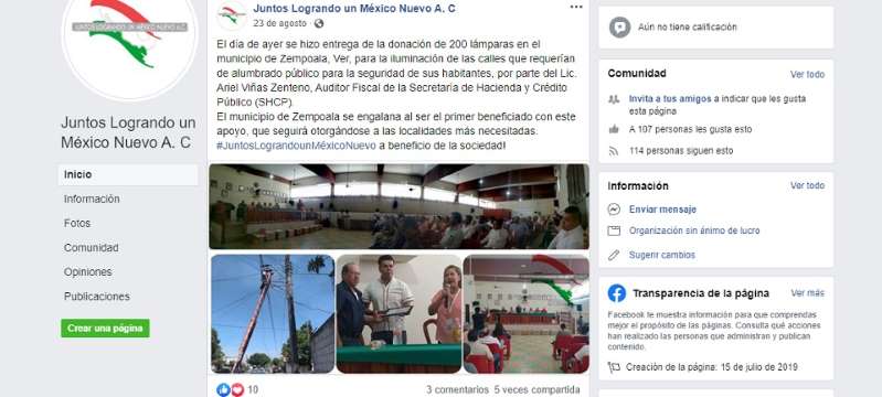 A dicha reunión, prosigue la publicación, “asistieron Ariel Viñas Zenteno, auditor fiscal de dicha dependencia, así como Sotero Mendoza Martínez, comisionado nacional del programa. En Juntos Logrando un México Nuevo estamos comprometidos por (sic) el bienestar de nuestra sociedad. Síguenos y entérate cómo ser beneficiario de este programa especial que se está gestionando a nivel nacional”.