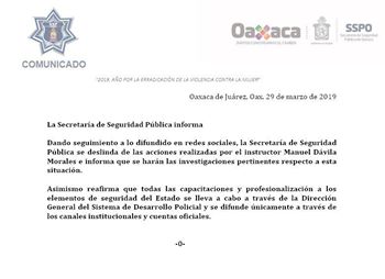 Oaxaca.-La Secretaria de Seguridad Pública de Oaxaca informó, respecto a la información difundida en redes sociales sobre la realización de un curso de balística forense, que los cursos de capacitación y profesionalización de los elementos son difundidos a través de los canales institucionales y cuentas oficiales.