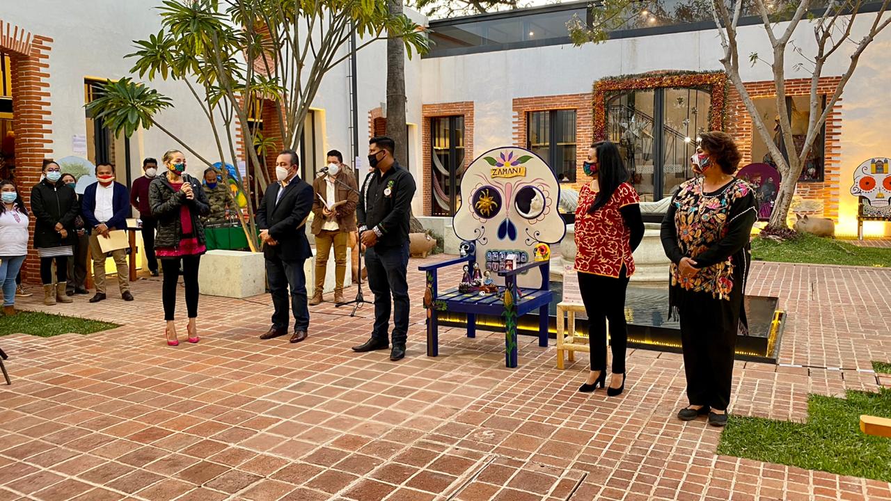 Oaxaca .- Como parte del programa Día de Muertos, la Secretaría de las Culturas y Artes de Oaxaca (Seculta), y el Instituto Oaxaqueño de las Artesanías (IOA), llevaron a cabo la inauguración de la exposición “Sillas calaveras”, que dio muestra de la habilidad y magia de artistas en talla de madera, intervención en textil y otras aplicaciones.