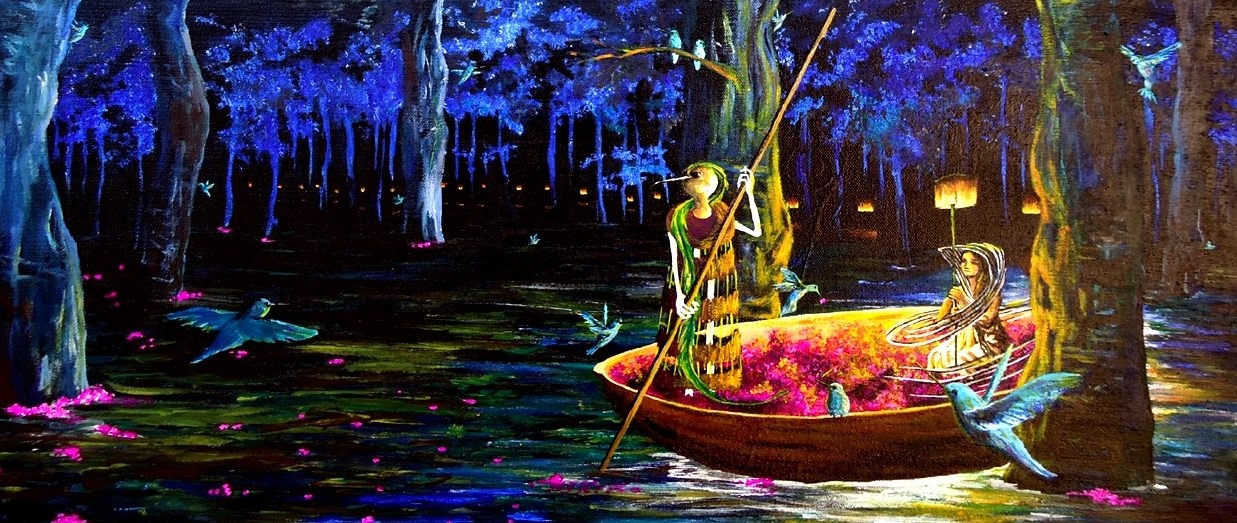 Con pincelada sobria y serena, trazos rítmicos y dulces, que bien podrían recordarnos al viento de la montaña o la neblina que peina los árboles, Nereyda hace surgir un mundo onírico, en el que se cancelan las leyes de la física: mujeres vuelan libres, peces surcan los cielos, dictándonos que una tarde cualquiera, la muerte y la vida se sientan a tomar un café. Durante ese lapso de tregua, el ser crece y camina por el mundo.