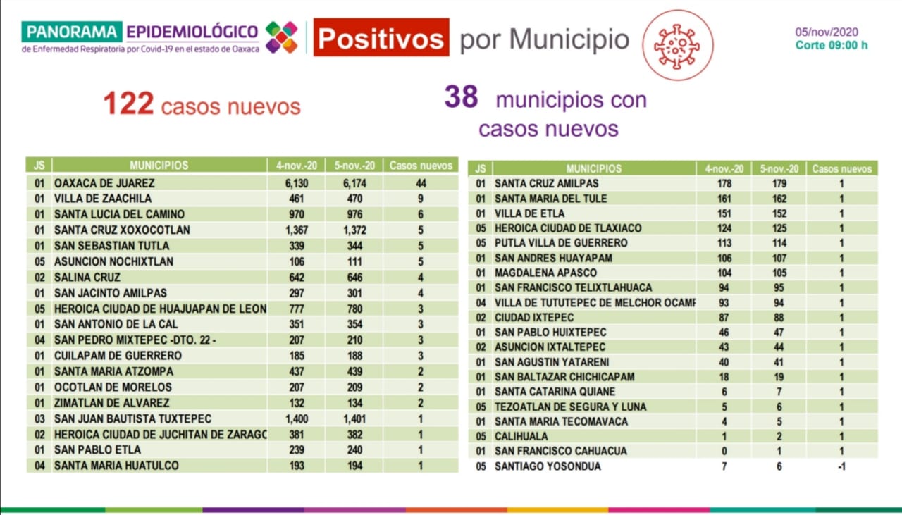 Respecto a los municipios que notificaron casos nuevos, enlistó que Oaxaca de Juárez encabeza la lista con 44 diagnósticos, seguido de Villa de Zaachila con nueve, Santa Lucía de Camino con seis, así como Santa Cruz Xoxocotlán, San Sebastián Tutla y Asunción Nochixtlán con cinco pacientes respectivamente, el resto cuatro, tres, dos y uno.
