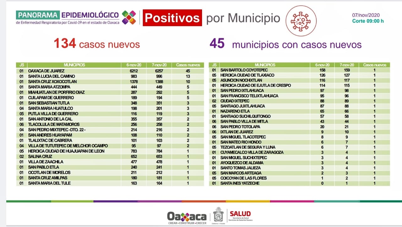 Sostuvo que de los 134 casos nuevos, se distribuyen en 45 municipios de la entidad, siendo los que mayor número de casos presentan, el de Oaxaca de Juárez con 45, Santa Lucia del Camino 13 y Santa Cruz Xoxocotlán 10.