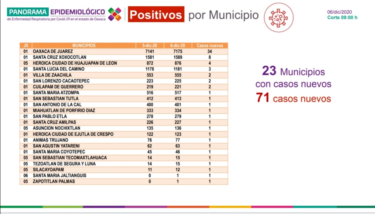 Sostuvo que los 71 casos nuevos de COVID-19, se distribuyen en 23 municipios, siendo los que mayor número de casos presentan: Oaxaca de Juárez con 34, Santa Cruz Xoxocotlán ocho, Huajuapan de León cuatro, Santa Lucía del Camino tres, el resto dos y un solo caso.