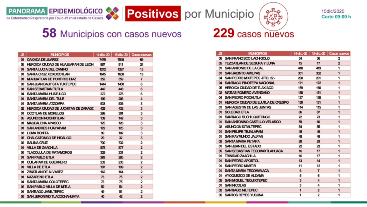 Señaló que los casos nuevos registrados las últimas 24 horas corresponden a 58 municipios, de los cuales: Oaxaca de Juárez contabiliza 69, Heroica Ciudad de Huajuapan de León 24, Santa Lucía del Camino 15, Santa Cruz Xoxocotlán 13, y Miahuatlán de Porfirio Díaz siete, el resto seis, cuatro, tres, dos y uno.