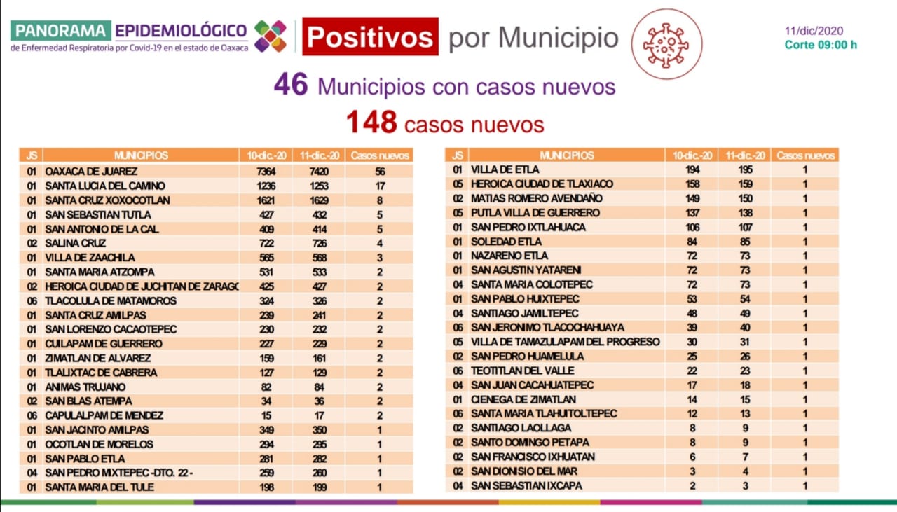 Detalló que los 148 casos nuevos de COVID-19 se distribuyen en 46 municipios, siendo los que mayor número presentan: Oaxaca de Juárez con 56, Santa Lucía del Camino 17, Santa Cruz Xoxocotlán ocho, San Sebastián Tutla y San Antonio de la Cal cinco cada uno, Salina Cruz cuatro, el resto tres, dos y un solo caso.