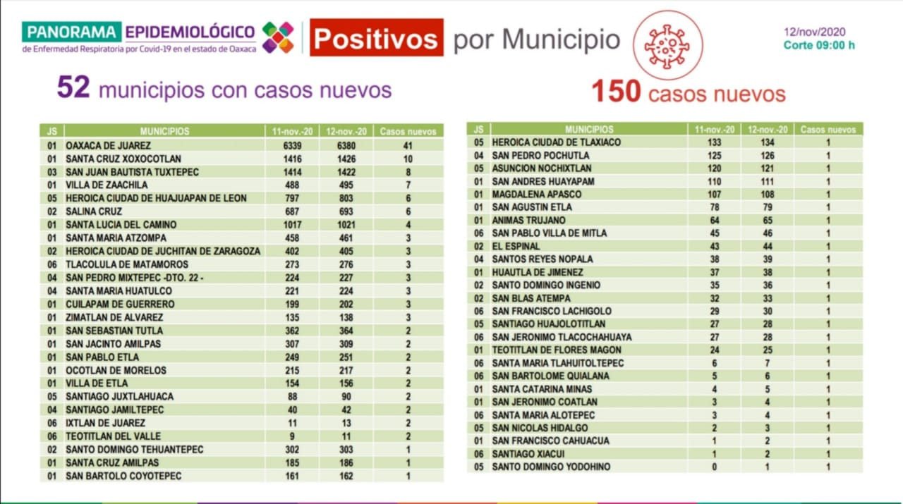 Matus Santiago dijo que los 150 casos nuevos de COVID-19 se han registrado en 52 municipios, siendo los que mayor número de casos presentan, el de Oaxaca de Juárez con 41, Santa Cruz Xococotlán 10, San Juan Bautista Tuxtepec ocho, Villa de Zaachila siete, Huajuapan de León y Salina Cruz seis cada uno, el resto cuatro, tres, dos y un caso.