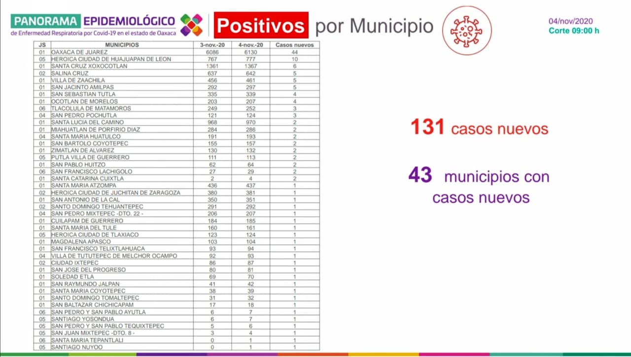 Añadió que los casos nuevos detectados en las últimas 24 horas corresponden a: Oaxaca de Juárez con 44, seguido de la Heroica Ciudad de Huajuapan de León con 10, Santa Cruz Xoxocotlán con seis, y Salina Cruz, Villa de Zaachila, San Jacinto Amilpas con cinco reportes respectivamente, el resto cuatro, tres, dos y uno.