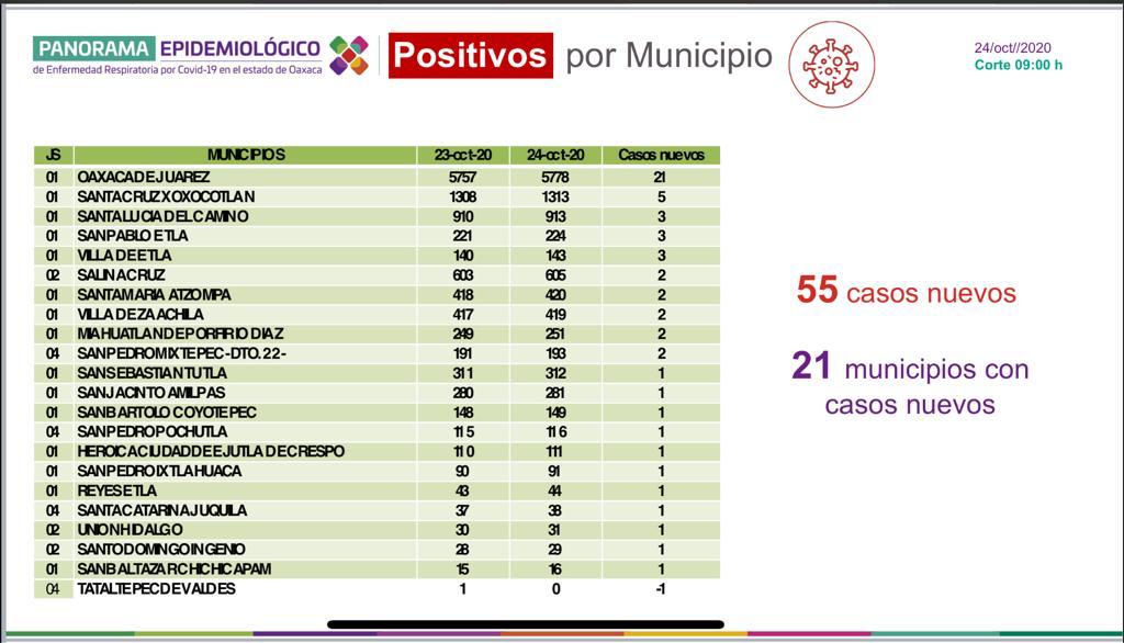 Sostuvo que los 55 casos nuevos se distribuyen en 21 municipios de la entidad, siendo los que mayor número presentan: Oaxaca de Juárez con 21, Santa Cruz Xoxocotlán cinco, Santa Lucía del Camino, San Pablo Etla y Villa de Etla, tres cada uno, el resto dos y un caso.