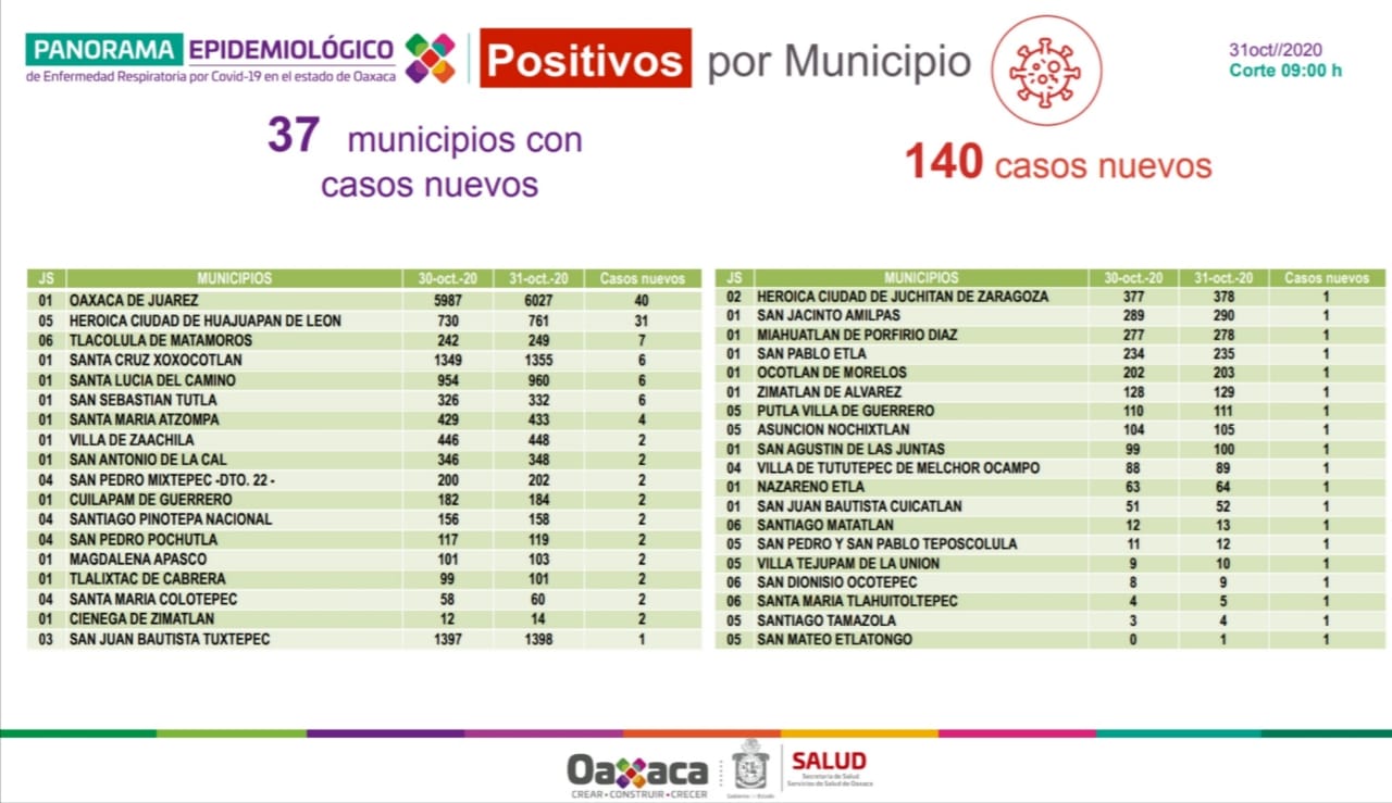 Ello, lo informó el subdirector general de Innovación y Calidad de los SSO, Héctor Matus Santiago, durante el corte informativo de la pandemia, donde dijo que este 31 de octubre se contabilizaron 140 casos nuevos de COVID-19 en 37 municipios, así como lamentablemente cinco defunciones.