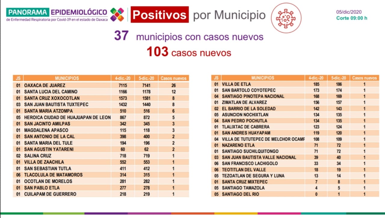 Sostuvo que los 103 casos nuevos de COVID-19, se distribuyen en 37 municipios, siendo los que mayor número presentan: Oaxaca de Juárez con 26, Santa Lucía del Camino 12, Santa Cruz Xoxocotlán y San Juan Bautista Tuxtepec ocho cada uno, Santa María Atzompa seis, Huajuapan de León cinco, el resto tres, dos y un solo caso.