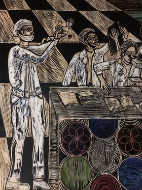 La obra pictórica realizada por el artista quien actualmente reside en Europa, es una pieza de gran formato trabajada con la técnica de grabado xilografía, realizada con base a una superficie de madera tallada con gubias o buriles, la obra ya se encuentra entintada para su exhibición. Es importante mencionar que la totalidad del mural se realizó a mano por el propio artista también realiza su obra plástica tanto en el campo de la pintura, el grabado y la escultura.