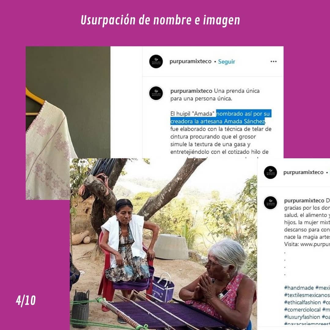A través de un comunicado Texinda, ubicada en Pinotepa de Don Luis, en su perfil de facebook https://www.facebook.com/purpura.tixinda/?ref=page_internal, denuncia como la comercializadora además de revender sus textiles, se apropió de fotografías de las artesanas trabajando para dar a entender a sus compradoras, que están al servicio de la marca Pùrpura Mixteco, la cual también usurpó el nombre de la cooperativa.