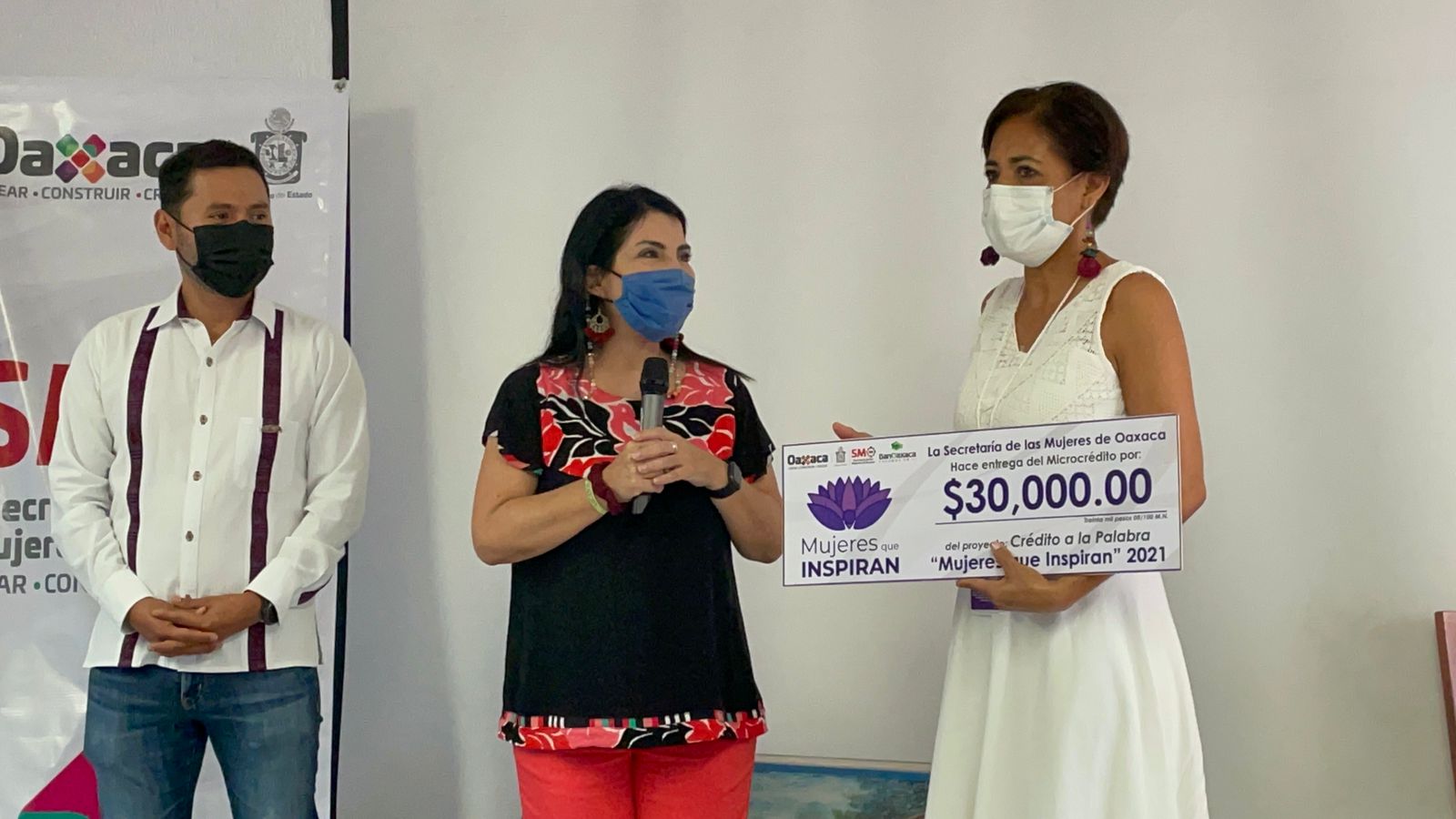 Al impulsar su autonomía económica a través de apoyos que a la fecha suman tan solo en esta región 674 mil pesos en beneficio de 136 mujeres, la funcionaria estatal y el director de BanOaxaca Igmar Medina Matus, hicieron entrega de créditos del programa “Mujeres que Inspiran 2021” a los grupos ‘Artesanas de la Costa’, ‘Emprendedoras de Pochutla’ y a Rosaura Zermeño Vásquez por un total de 35 mil pesos.