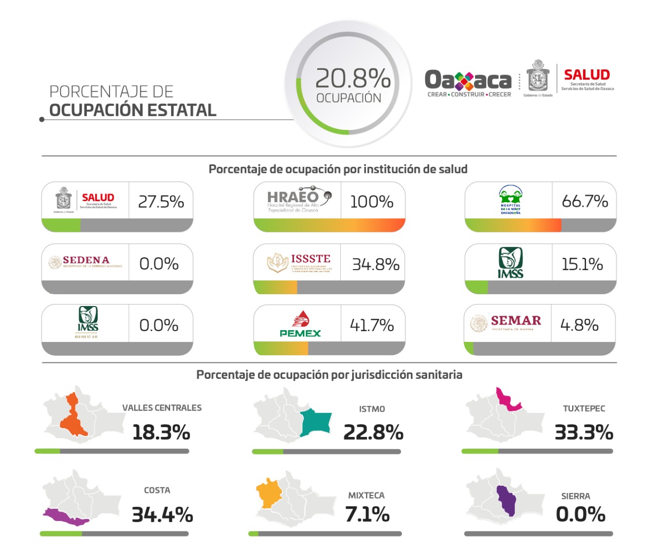 El día de hoy se notificaron 38 municipios con presencia de nuevos pacientes, con la mayor cifra en la Heroica Ciudad de Juchitán de Zaragoza con 16 casos, Oaxaca de Juárez con 13, San Juan Bautista Tuxtepec con 11, Santo Domingo Ingenio con ocho y Salina Cruz con seis, el resto cuatro, tres, dos y una notificación.