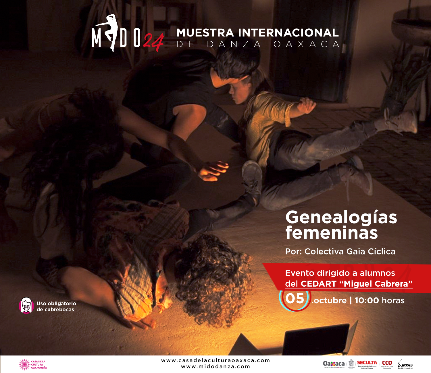 Oaxaca .- La edición 24 de la Muestra Internacional de Danza Oaxaca (MIDO) arranca este miércoles 05 de octubre con dos actividades escénicas: Genealogías femeninas y Paralelo 64, ambas piezas serán presentadas por Colectiva Gaia Cíclica y la Compañía Estatal de Danza Contemporánea, a las 10:00 y 19:00 horas, respectivamente.