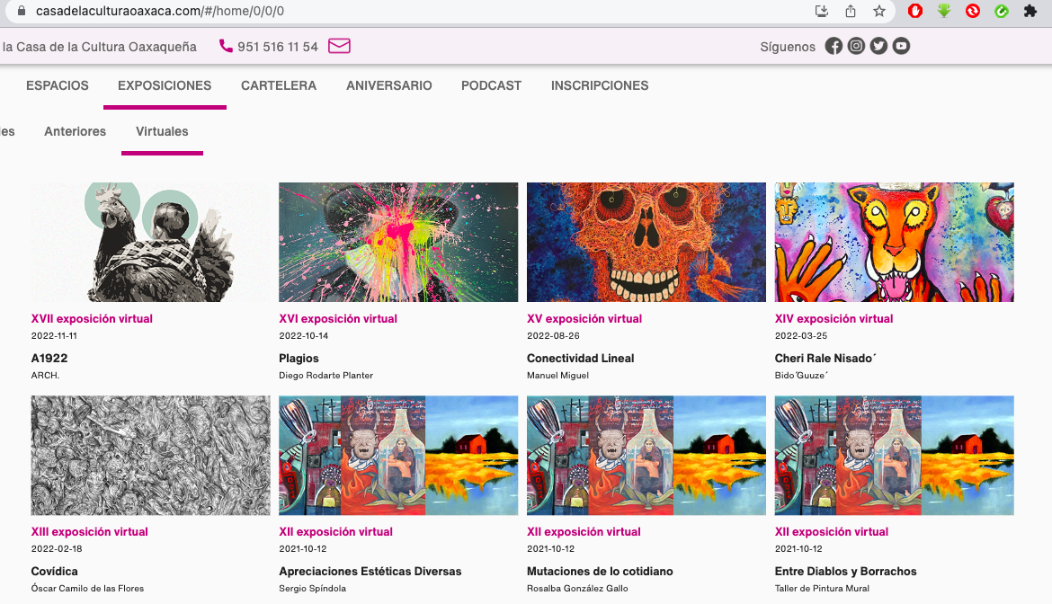 Derivado de que la emergencia sanitaria por la COVID-19 ocasionó el cierre de los espacios culturales, la Casa de la Cultura Oaxaqueña implementó, como un acto de solidaridad con la comunidad artística de Oaxaca, la galería virtual alojada en su portal institucional www.oaxaca.gob.mx/cco y que, recientemente, migró al micrositio www.casadelaculturaoaxaca.com para una mejor visualización de la información.