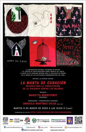Dentro de las actividades conmemorativas la creadora Marietta Bernstroff participará en una charla virtual el martes 8 de marzo a las 12 del día, "La manta de curación. Retazos para la visibilización de la violencia contra las mujeres" en una transmisión desde el canal de Youtube https://www.youtube.com/user/cisanunamweb como moderadora y coordinadora académica estará la doctora Graciela Martínez-Zalce, directora del Centro de Investigaciones sobre América del Norte de la UNAM.