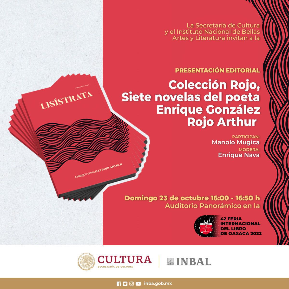 Gracias al trabajo del personal de la Subdirección Editorial de la Dirección de Difusión y Relaciones Públicas en el Centro Cultural de Convenciones de Oaxaca, el domingo 23 de octubre, a partir de las 16:00 horas, se presentará la Colección Rojo, Siete novelas del poeta Enrique González Rojo Arthur. En esta actividad estará Manolo Mugica. La cita es en el Auditorio Panorámico (144 pax).