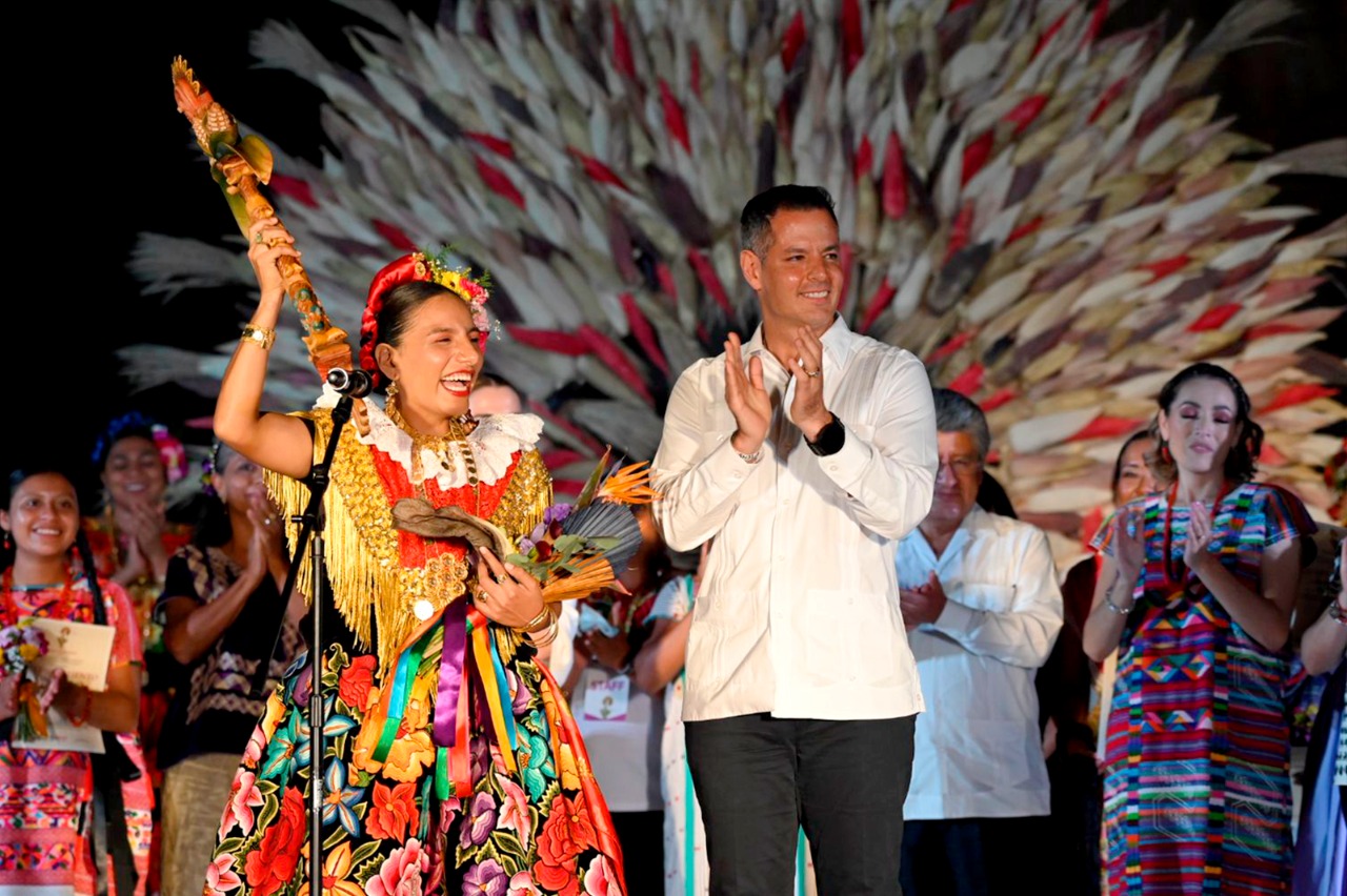 Oaxaca-Ante decenas de personas que se dieron cita en el jardín El Pañuelito, sede de este encuentro, el gobernador Alejandro Murat Hinojosa hizo entrega del cetro a la ganadora, quien junto a otras 41 participantes de todo el estado compartió sus conocimientos sobre su cultura, lengua indígena, artesanías, música, canto, danza, mitos, cuentos, leyendas, tradiciones, indumentaria, cocina y medicina tradicional.