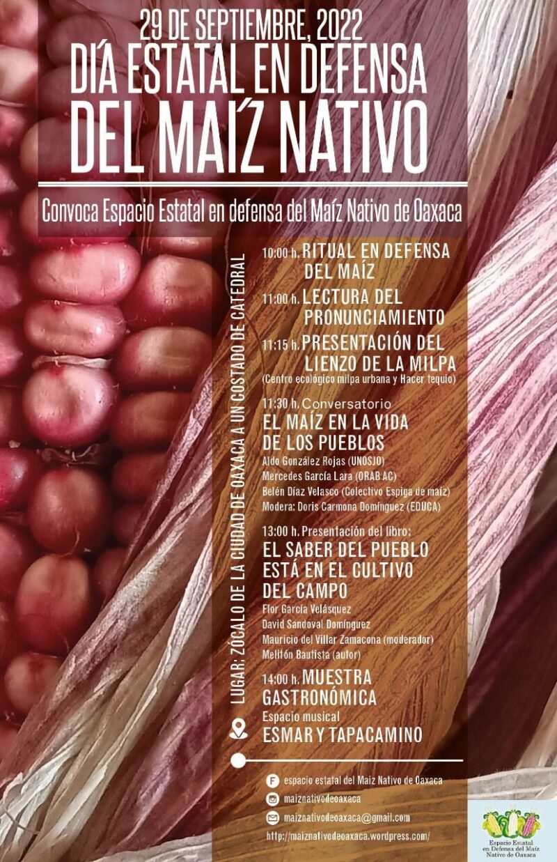 Oaxaca.-Para el Día del Maíz 2022, este año el Espacio Estatal en Defensa del Maíz Nativo hace una cordial invitación “para que nos acompañen este 29 de septiembre a partir de las 10 de la mañana a un lado de la Catedral, en el mero centro de la ciudad de Oaxaca”.