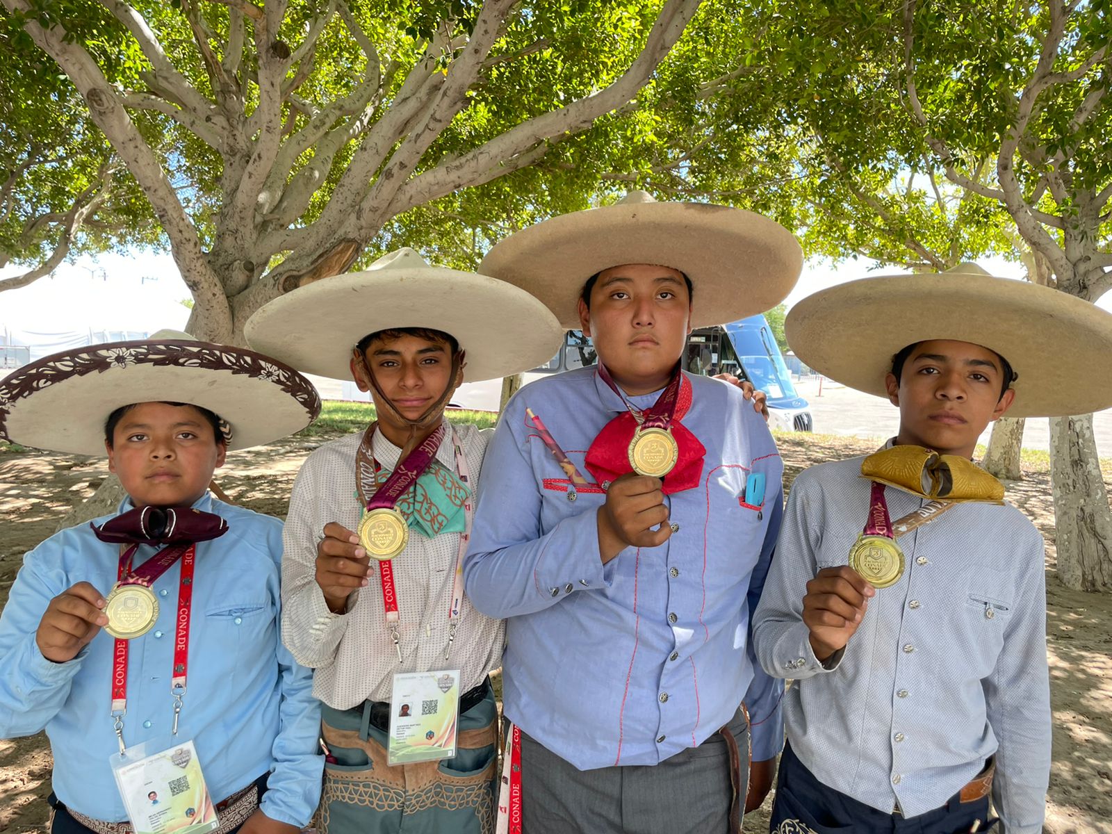 En charrería Emiliano Sibaja, Bryan Mendoza, Yoltic Mejía y Víctor Guerrero, lograron la medalla de oro en bloques, modalidad terna en el ruedo, jineteo de toro, lazo de cabeza y pial en el ruedo, en el primer debut oaxaqueño de este deporte.