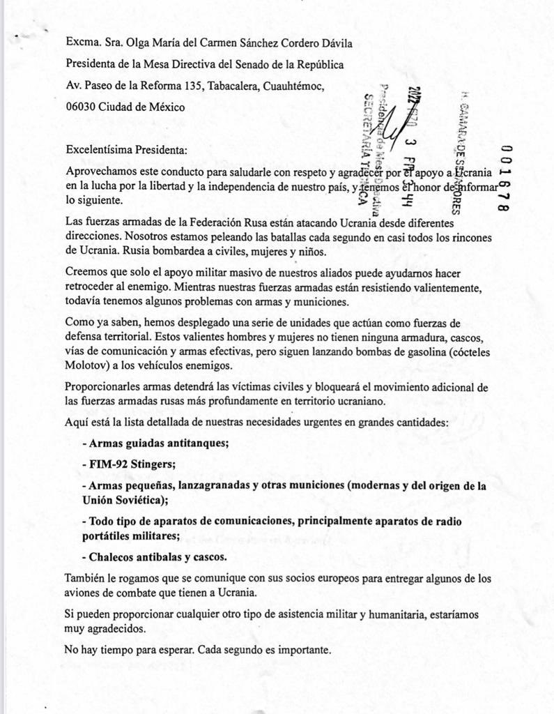 La carta fue firmada por seis integrantes del Parlamento ucraniano y se encuentra dirigida a la presidenta de la Mesa Directiva del Senado, Olga Sánchez Cordero. Entre los requerimientos se encuentra: armas guiadas, antitanques, misiles aéreos, armas pequeñas, lanzagranadas y otras municiones, chalecos antibalas y cascos.
