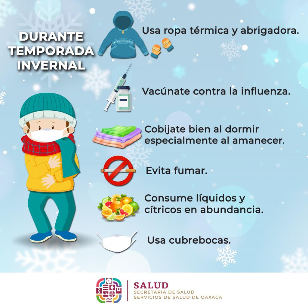 La dependencia señaló que ante la presencia de temperaturas gélidas principalmente por la mañana y noche, sobre todo en Sierra Norte y Sierra Sur, Mixteca y Valles Centrales, es necesario reforzar las medidas preventivas, usar cubrebocas en espacios cerrados, lavado de manos de manera frecuente, así como cubrirse nariz y boca con pañuelo desechable o el ángulo interno del codo al toser o estornudar.