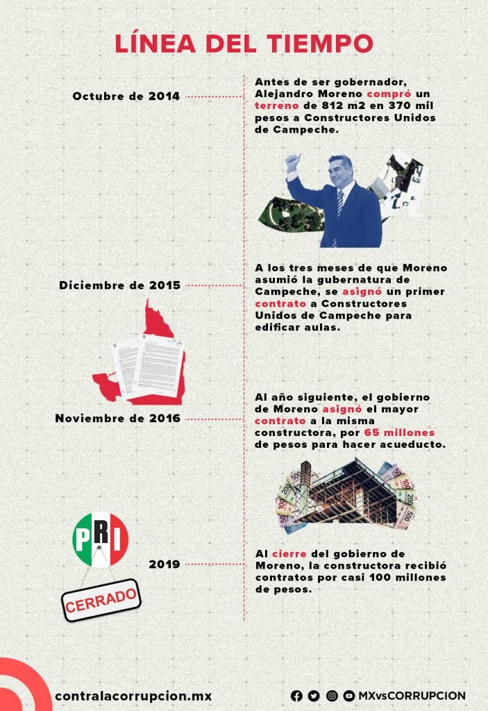 En octubre de 2014, once meses antes de que Alejandro Moreno ganara las elecciones y consiguiera ser gobernador de la entidad del sureste, adquirió por 370 mil pesos un terreno de 812 metros cuadrados con la empresa Constructores Unidos de Campeche SA de CV.