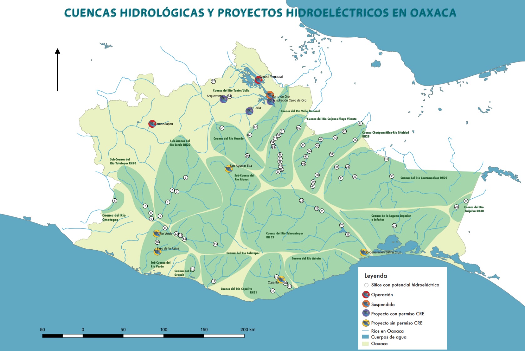 El mapa que ofrecemos da cuenta de estos proyectos, para efectos visuales se han dividido por cuencas hidrológicas y se enumeran y se colocan también los estados en que se encuentran o denominan con autorización de la Comisión Reguladora de Energía (ente facultado en materia energética) o sin autorización.