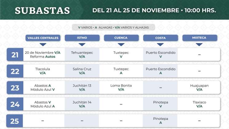 El viernes en las sucursales de Abastos, Módulo Azul, Juchitán 14, Pinotepa Nacional y Tlaxiaco, para terminar el sábado 25 de noviembre en la región de la Costa.