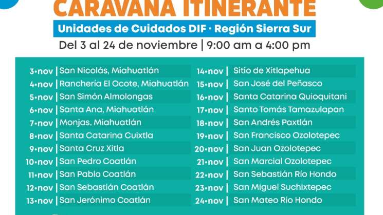 La Caravana continuará el 11 de noviembre en San Pablo Coatlán, el 12 estará en San Sebastián Coatlán, el 13 en San Jerónimo Coatlán, el 14 en Sitio de Xitlapehua y el 15 en San José del Peñasco.