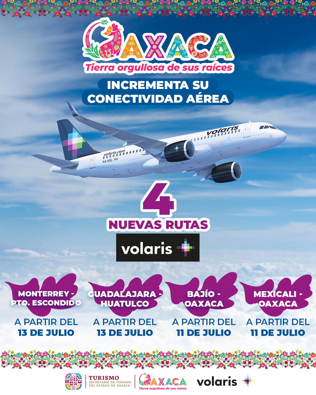 Oaxaca .- La Secretaría de Turismo del Gobierno del Estado anunció que, a partir del 11 de julio, Oaxaca tendrá cuatro nuevas rutas aéreas que conectarán a los tres principales destinos de la entidad con otros del país, a través de la aerolínea Volaris.