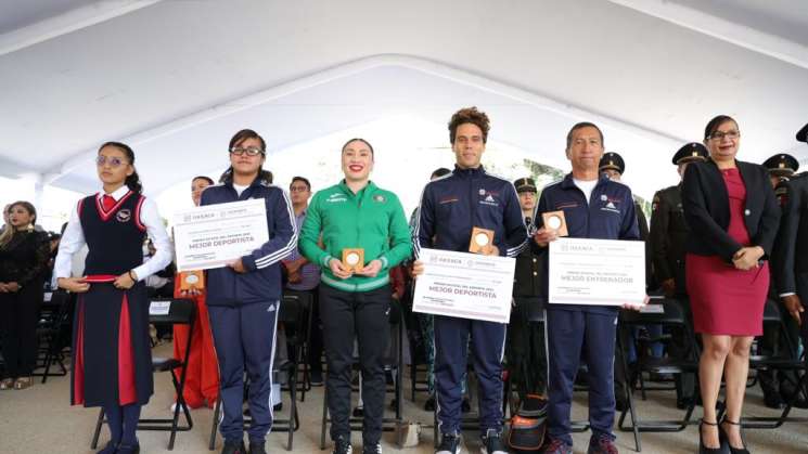 En el marco de este acto conmemorativo, el Gobernante oaxaqueño entregó el Premio Estatal del Deporte 2023 a la nadadora Sahara Monroy García, la karateca Xhunashi Guadalupe Caballero Santiago, el surfista Sebastián Williams Hernández y el entrenador de natación Guillermo Velasco Aragón.