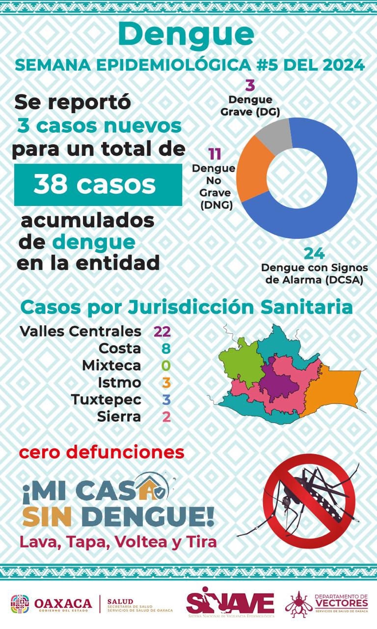 SSO informó que al corte de la semana epidemiológica número cinco, se registraron tres casos nuevos de dengue, los cuales se ubican dos en la Jurisdicción Sanitaria número 4 Costa y uno en la Jurisdicción Sanitaria número 1 Valles Centrales, que suman 38 en toda la entidad, de los cuales 11 corresponden a Dengue No Grave (DNG), 24 a Dengue Con Signos de Alarma (DCSA) y tres a Dengue Grave (DG).